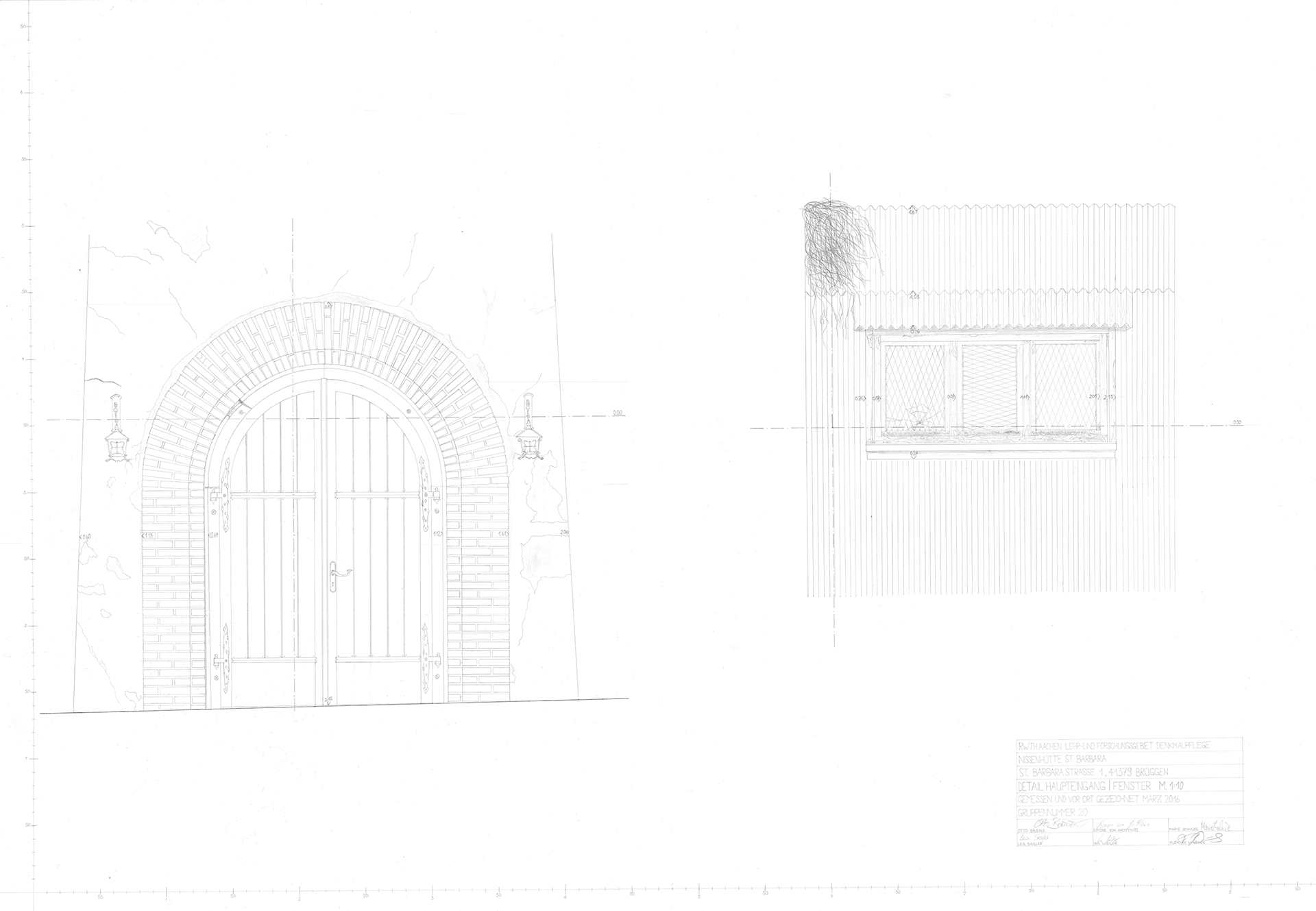 Das zu vermessende Gebäude liegt im beschaulichen Brüggen, bei Viersen, im Nordwesten von Mönchengladbach. Auf einem Campingplatz, der einst als Kasernenbereich des ehemaligen 3 Base Ammunition Depots (3 BAD) Brüggen - Bracht genutzt wurde, steht die Nissenhütte, die 1957 - 58 von britischen Streitkräften errichtet wurde. Es handelt sich um eine nach Westen orientiert, langgestreckte Wellblechbaracke mit leicht über-halbkreis-großem Tonnenquerschnitt. Der Innenraum wurde 1965 nach einem Brand erneuert. Heute befindet sich das kleine Gotteshaus im Besitz des Campingplatzinhabers. Die beiden Giebelwände sind massiv aus Backstein errichtet und glatt verputzt. Der Ostgiebel ist mit einem rundbogigen, backsteinsichtig gerahmten Portal mit schlichter, einteiliger Holztür versehen. Diese wird von je einer Fensteröffnung mit backsteinseitigem, geradem Sturz und zweibahnigen Fenstern mit umlaufenden glatten Backsteingesims flankiert. An der Nordseite befinden sich vier, an der Südseite zwei je dreibahnige Schleppgauben, die den Inneraum mit natürlichem Licht versorgen. An der Südseite, vor dem westlichen Gebäudeviertel, befindet sich ein zweigeschossiger, massiver, glatt verputzter Glockenturm mit rundbogigem, abgetreppt backsteinsichtig gerahmten Eingang. Der Glo-ckenturm ist leicht in das Tonnengewölbe eingerückt und so mit der Nissenhütte verbunden. In der Ost und Westwand des Erdgeschosses befindet sich ein backsteinsichtig gerahmtes Rundfenster. Das Ober-geschoß ist vierseitig mit je drei rundbogigen Schallöffnungen versehen. Die mittlere Öffnung ist etwas größer als die beiden seitlichen, was dem Turm eine sakrale Wirkung verleiht. Der Glockenturm hat ein flaches, verschiefertes Zeltdach über einem mehrfach abgetreppten, glatten Gesims. Der tonnengewölbte Innenraum ist durchgängig mit Hartfaserplatten verkleidet. Er verfügt über einen spitzbogigen Triumphbogen zu dem drei Stufen erhöhten Chor. Die Fenster sind original und farbig ver-glast. Auf einem der Fenster befindet sich die Darstellung der heiligen Barbara und die Inschrift: „G. Maile Studio, Canterburry, Kent“. Im Innenraum ist ebenfalls ein originaler Altartisch vorhanden.